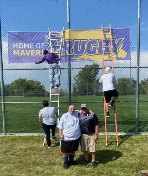 NEW BANNER SHOWING "THE HOME OF MAVIRICK RUGBY" INSTALLED AT PETERSEN PITCH. With the help of the current Men's Team members, MSU Rugby Alumni Presidents Bob Eichens and Jay Ziesmer, pose as the Rugby Alumni donated this new banner that will be on display at the rugby pitch.