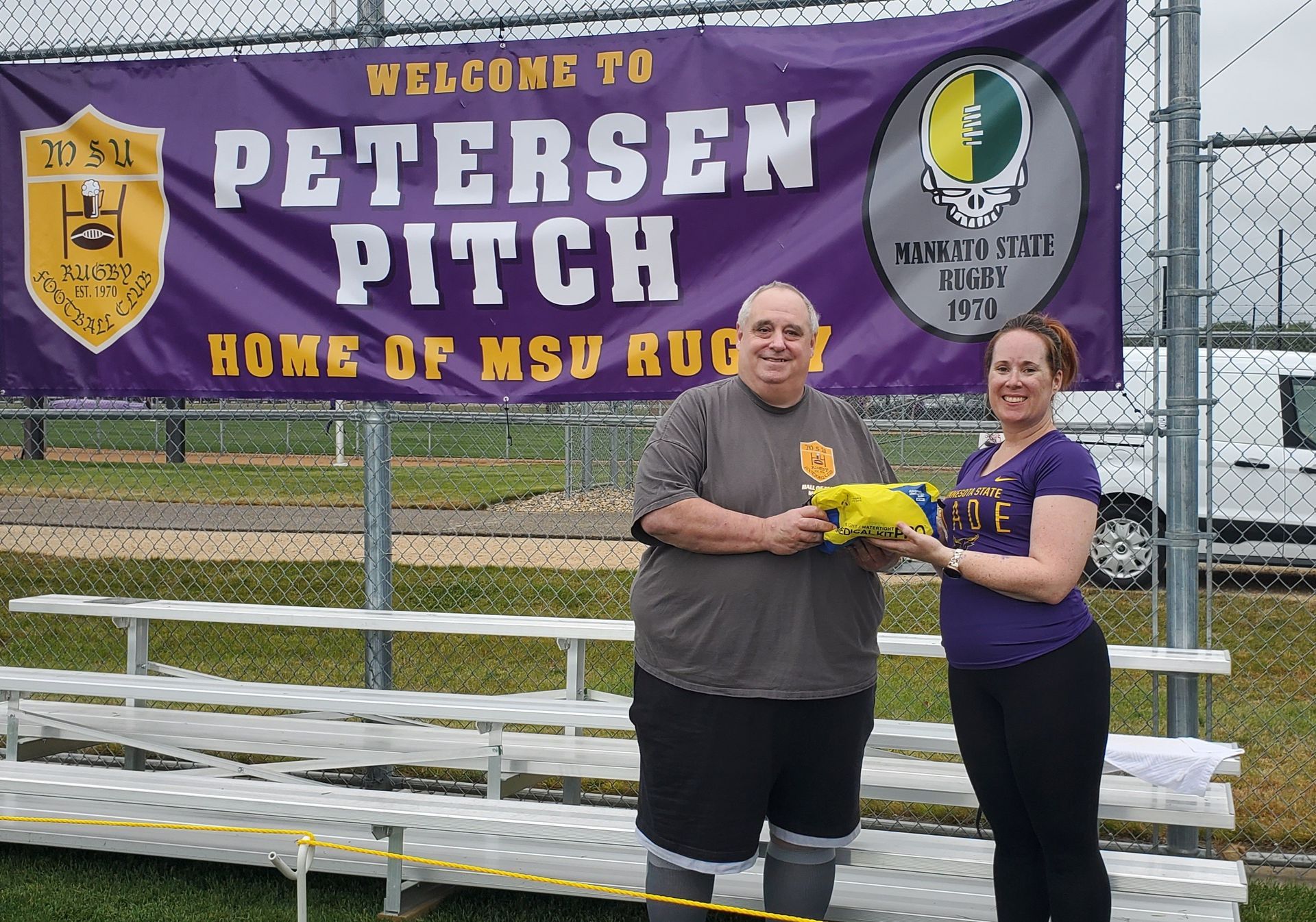 On September 14th, 2024, Jay Ziesmer, MSU Rugby Alumni Chairman, presented a new on-field Medical / First Aid Kit to Jessi Helmich-Mans on behalf of the MSU Rugby Alumni. Jessi takes care of our players on Match Day.